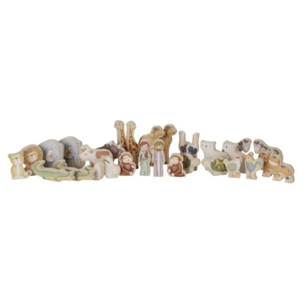 | Inhoud verpakking | 1 Ark, 1 Noach, 1 vrouw, 2 leeuwen, 2 olifanten, 2 zebra’s, 2 apen, 2 duiven, 2 krokodillen, 2 schildpadden, 2 giraffen, 2 struisvogels, 2 koeien, 1 kip en 1 haan. |