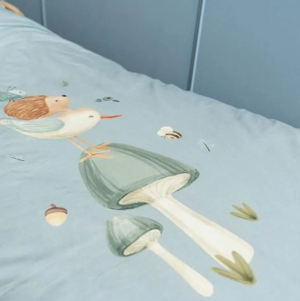 Voeg een vleugje design toe aan de kinderkamer met een prachtig opgemaakt bed. Met dit dekbedovertrek voor een peuterbed zal je kleintje heerlijk wegdromen naar avontuur. Het collectie Forest Friends inspireert de mooiste dromen over een avontuurlijk bos waarin een vogel, egeltje en kevertje balanceren op een paddenstoel. Het zachte dekbedovertrek is gemaakt van 100% biologisch in een effen Denim Blue kleur versierd met een speels tafereel uit het bos. Zowel de kussensloop als het dekbedovertrek zijn comfortabel, mooi afgewerkt en hebben een goed ademend vermogen. Het formaat van het dekbedovertrek is 120 x 150 cm en de kussensloop is 40 x 60 cm.