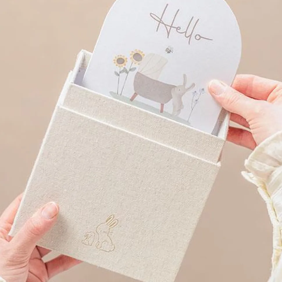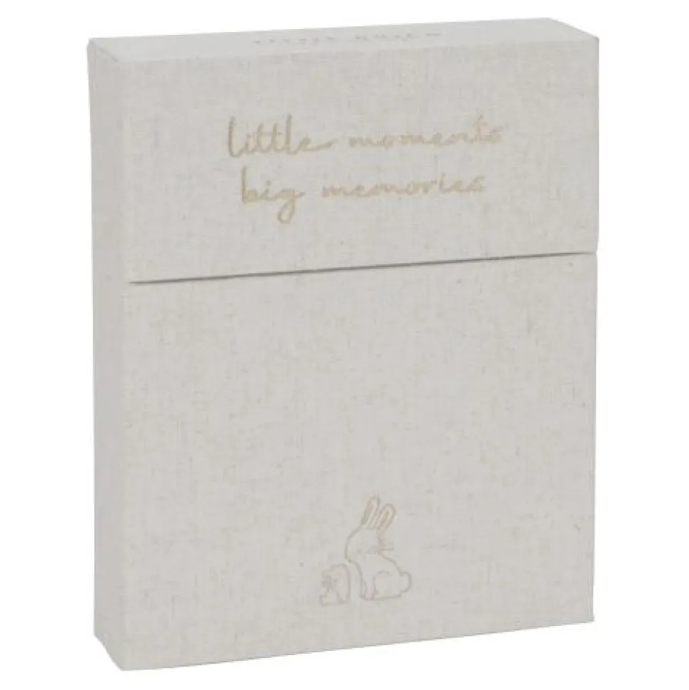 De mijlpaalkaarten worden bewaard in een prachtig lichtbeige doosje, versierd met luxe linnen stof. Het doosje is gedecoreerd met de tekst ‘Little moments, big memories’ en het betoverende Baby Bunny ontwerp dat ook de mijlpaalkaarten siert. Het is de perfecte plek voor de onvergetelijke momenten van je kleine engeltje, waardoor het een schatkist van herinneringen wordt die een leven lang gekoesterd zullen worden.