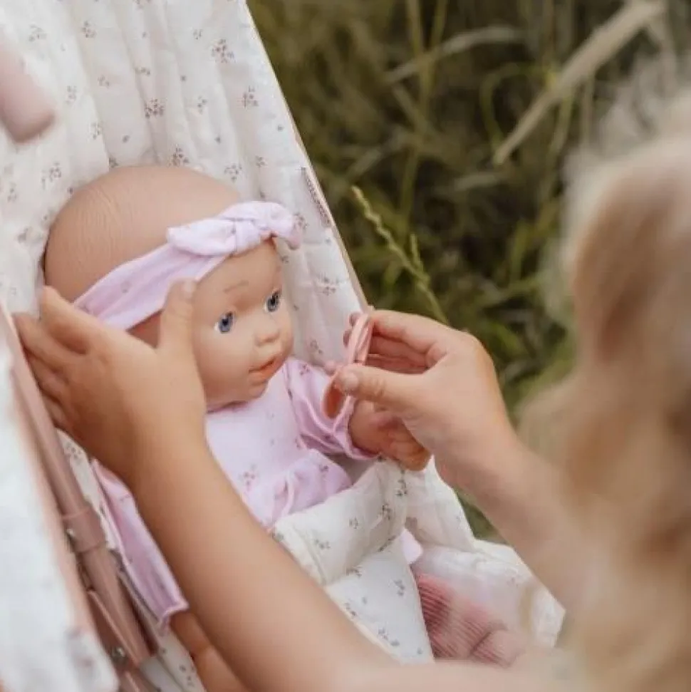 Maak kennis met baby Lily. Geef haar een knuffel en zorg voor haar. Lieve Lily is een schattige en levensechte pop met een zacht en knuffelbaar lijfje en zal je hart direct veroveren. Je kunt haar kleding verwisselen, haar helpen in slaap te vallen en haar kalmeren met de fopspeen. Als ze honger heeft, geef haar dan de fles met melk. Kinderen houden ervan om alles na te doen wat hun ouders doen, en deze babypop zal jouw kleintje inspireren om de verzorgende rol te spelen. Lily draagt een haarband en jurkje met lange mouwen in het Rosy Meadows dessin, en daaronder een ribbroekje. Het verwisselen van haar kleding bevordert fijne motorische vaardigheden, en de fopspeen en melkfles voegen een interactief element toe aan het spelen.