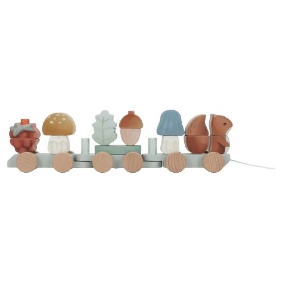 Choo choo! Verzamel alle lieve diertjes, paddenstoelen en schatten uit het bos en spring aan boord voor een magische reis. Stapel de blokken één voor één op de drie wagons van deze houten stapeltrein en ga op reis met de vriendjes van Forest Friends. De eekhoorn neemt het voortouw en zit vooraan. Welke paddenstoel volgt en waar hoort de dennenappel? Elk blok vormt een stukje van het verhaal van jouw verbeelding. Een leuke manier om te spelen en tegelijkertijd de hand-oogcoördinatie te ontwikkelen. De trein bestaat uit 18 onderdelen en is ongeveer 45 cm lang.