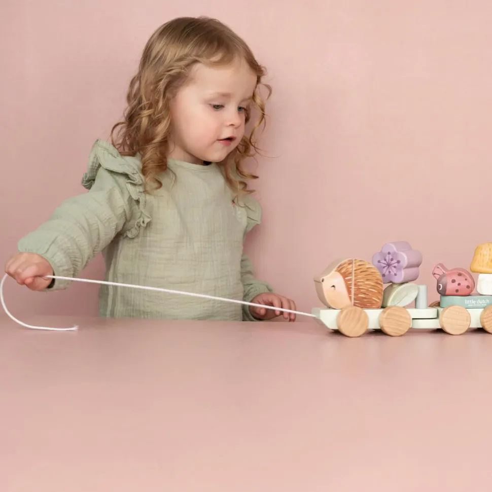 Choo choo! Verzamel alle lieve diertjes, bloemen en schatten uit Fairy Garden en spring aan boord voor een magische reis. Stapel de blokken één voor één op de drie wagons van deze houten stapeltrein. De egel neemt het voortouw en zit vooraan. Welke bloem volgt en waar zit het lieveheersbeestje? Elk blok vormt een stukje van het verhaal van jouw verbeelding. Een leuke manier om te spelen en tegelijkertijd de hand-oogcoördinatie te ontwikkelen. De trein bestaat uit 15 onderdelen en is ongeveer 45 cm lang.