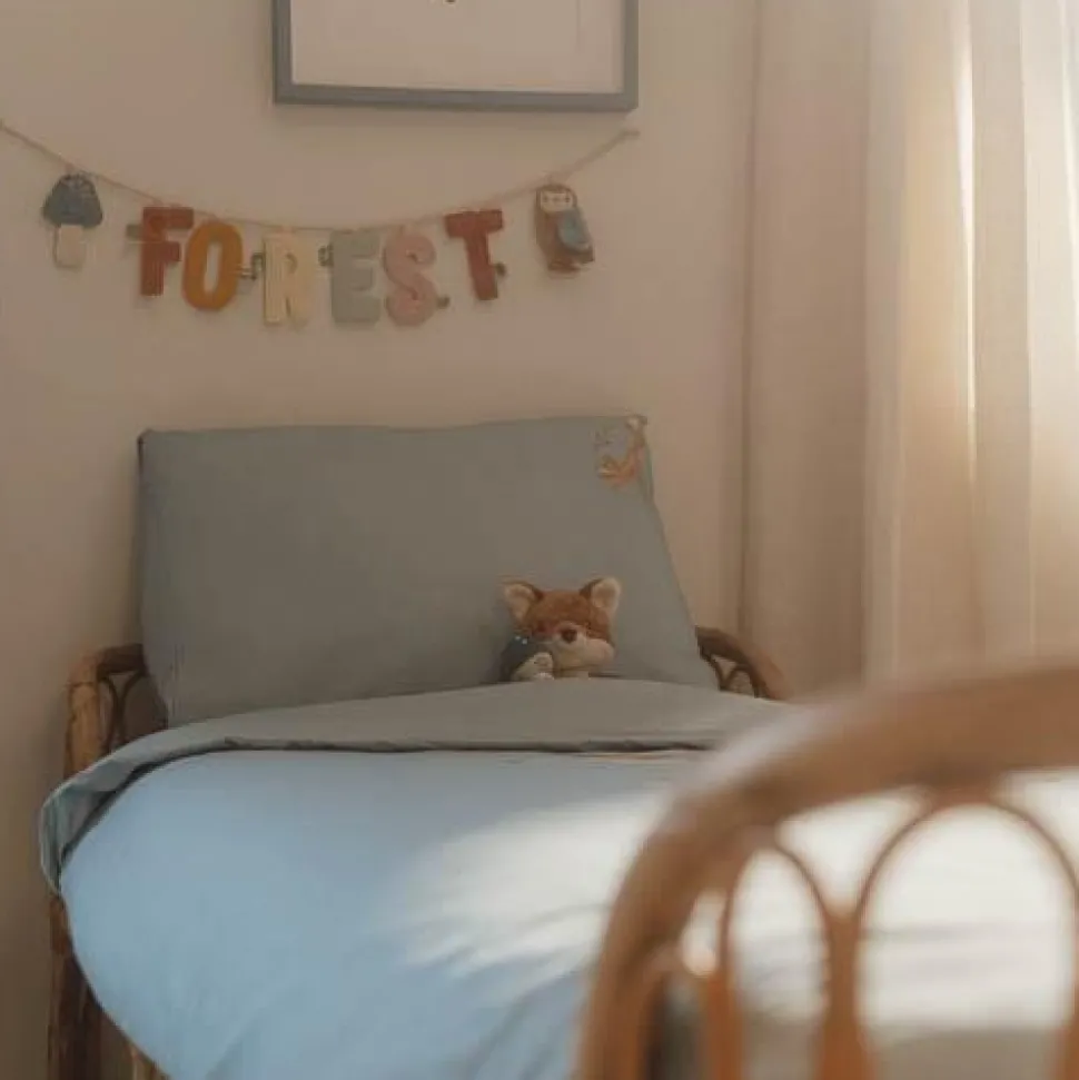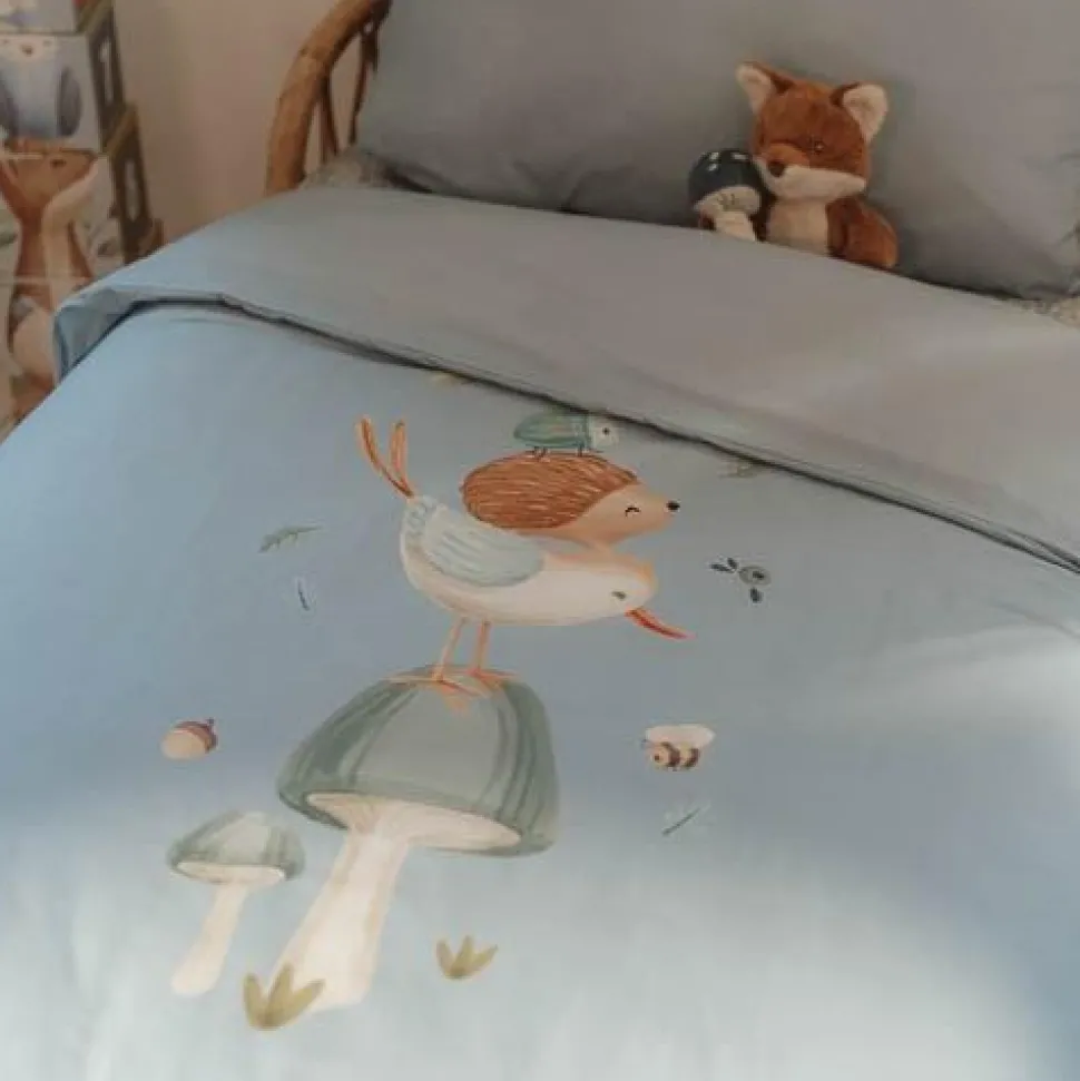 Voeg een vleugje design toe aan de kinderkamer met een prachtig opgemaakt bed. Met dit dekbedovertrek voor een peuterbed zal je kleintje heerlijk wegdromen naar avontuur. Het collectie Forest Friends inspireert de mooiste dromen over een avontuurlijk bos waarin een vogel, egeltje en kevertje balanceren op een paddenstoel. Het zachte dekbedovertrek is gemaakt van 100% biologisch in een effen Denim Blue kleur versierd met een speels tafereel uit het bos. Zowel de kussensloop als het dekbedovertrek zijn comfortabel, mooi afgewerkt en hebben een goed ademend vermogen. Het formaat van het dekbedovertrek is 120 x 150 cm en de kussensloop is 40 x 60 cm.
