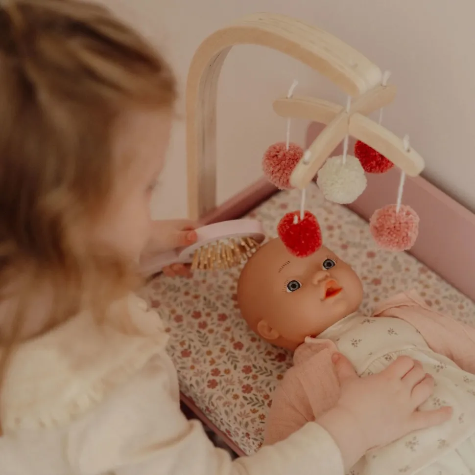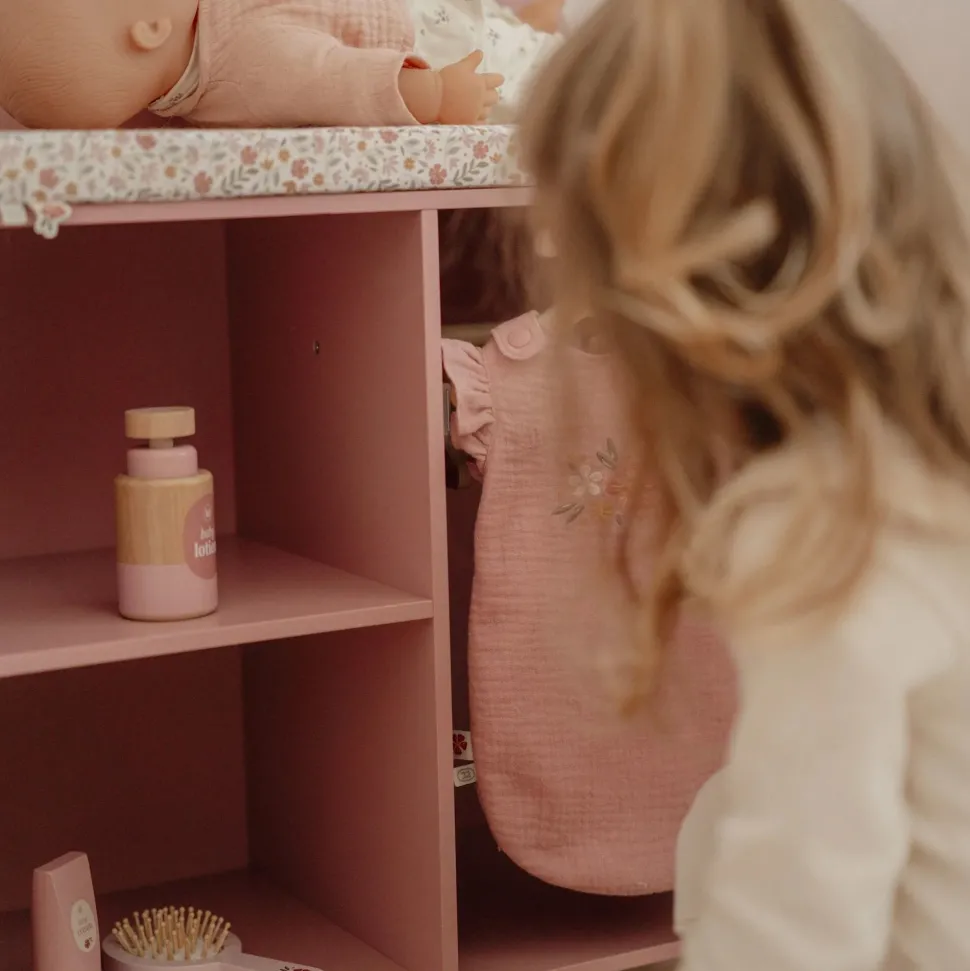 Deze prachtige poppencommode biedt alles wat je nodig hebt om je pop liefdevol te verzorgen. De set is inclusief een mobiel, een heerlijk zacht aankleedkussen met het dromerige Soft Flowers-dessin en diverse houten verzorgingsaccessoires. Daarnaast bevat de commode een luier, een slaapzak en schattige kledinghangers om de outfits van je pop netjes op te bergen. Het kastje biedt extra opbergruimte voor alle benodigdheden, zodat je pop altijd goed verzorgd wordt.