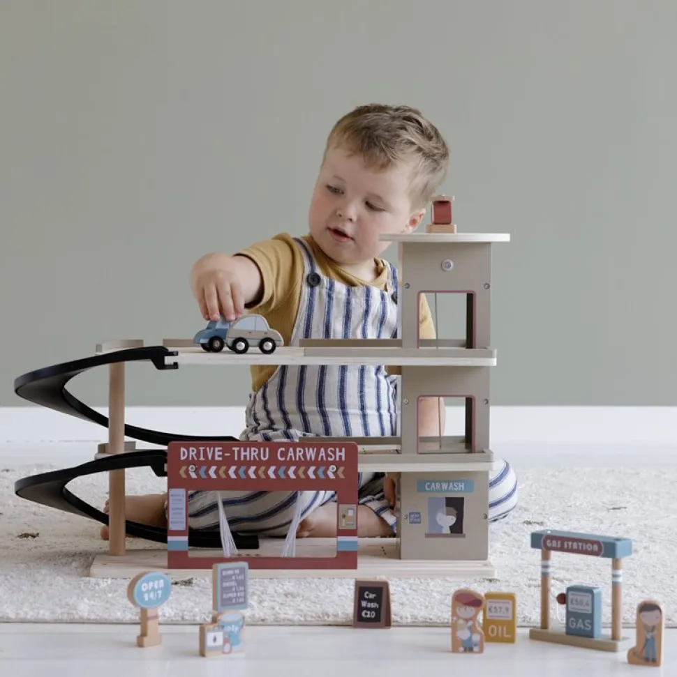 Stop bij de garage om benzine te tanken, je auto te parkeren of laat ‘m schoonmaken in de wasstraat. De uitbreiding bevat een garage met carwash, auto’s, helikopter, benzinestation, pompen, borden en medewerkers. De houten garage is één van de vele speelsets die gekoppeld kan worden aan de treinset XXL van Little Dutch. Op de garage vind je een helikopterplatform en de houten figuren zijn aan beide kanten voorzien van een gedetailleerde illustratie. Je maakt de garage helemaal af met de treinset XXL en de uitbreidingssets voor uren speelplezier. Bij deze set zijn geen rails stukken inbegrepen.
